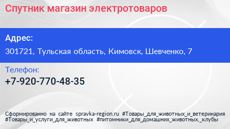 Спутник, магазин электротоваров по адресу 301721, Тульская область, Кимовск, Шевченко, 7 в дальнейшем Организация, размещена в следующих категориях: