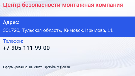 Центр безопасности, монтажная компания по адресу 301720, Тульская область, Кимовск, Крылова, 11 в дальнейшем Организация, размещена в следующих категориях: