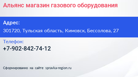 Альянс, магазин газового оборудования по адресу 301720, Тульская область, Кимовск, Бессолова, 27 в дальнейшем Организация, размещена в следующих категориях: