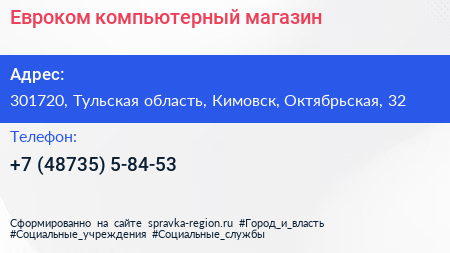 Евроком, компьютерный магазин по адресу 301720, Тульская область, Кимовск, Октябрьская, 32 в дальнейшем Организация, размещена в следующих категориях: