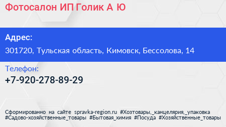 Фотосалон, ИП Голик А.Ю. по адресу 301720, Тульская область, Кимовск, Бессолова, 14 в дальнейшем Организация, размещена в следующих категориях: