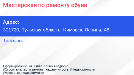 Мастерская по ремонту обуви по адресу 301720, Тульская область, Кимовск, Ленина, 48 в дальнейшем Организация, размещена в следующих категориях: