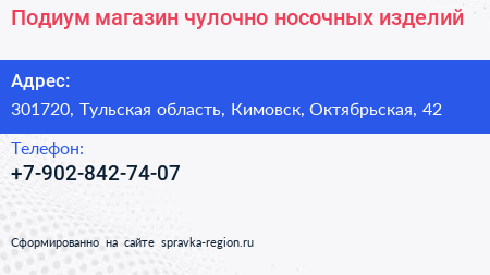 Подиум, магазин чулочно-носочных изделий по адресу 301720, Тульская область, Кимовск, Октябрьская, 42 в дальнейшем Организация, размещена в следующих категориях: