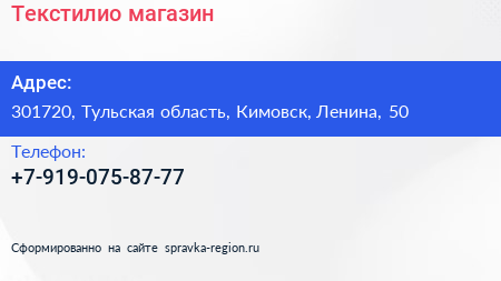 Текстилио, магазин по адресу 301720, Тульская область, Кимовск, Ленина, 50 в дальнейшем Организация, размещена в следующих категориях: