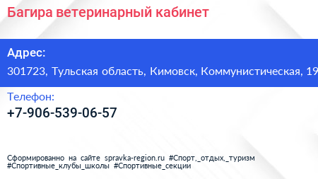 Багира, ветеринарный кабинет по адресу 301723, Тульская область, Кимовск, Коммунистическая, 19 в дальнейшем Организация, размещена в следующих категориях: