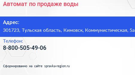 Автомат по продаже воды по адресу 301723, Тульская область, Кимовск, Коммунистическая, 5а в дальнейшем Организация, размещена в следующих категориях: