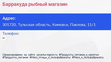 Барракуда, рыбный магазин по адресу 301720, Тульская область, Кимовск, Павлова, 11/1 в дальнейшем Организация, размещена в следующих категориях: