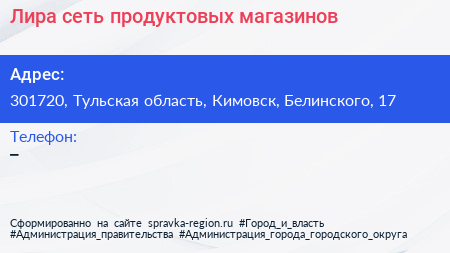 Лира, сеть продуктовых магазинов по адресу 301720, Тульская область, Кимовск, Белинского, 17 в дальнейшем Организация, размещена в следующих категориях: