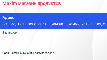 Maxim, магазин продуктов по адресу 301723, Тульская область, Кимовск, Коммунистическая, 6 в дальнейшем Организация, размещена в следующих категориях: