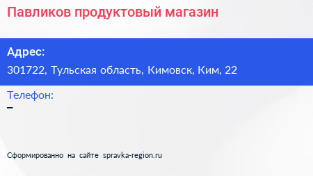 Павликов, продуктовый магазин по адресу 301722, Тульская область, Кимовск, Ким, 22 в дальнейшем Организация, размещена в следующих категориях: