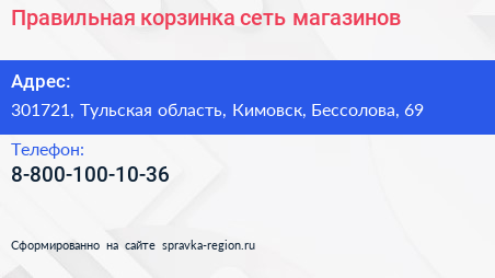 Правильная корзинка, сеть магазинов по адресу 301721, Тульская область, Кимовск, Бессолова, 69 в дальнейшем Организация, размещена в следующих категориях: