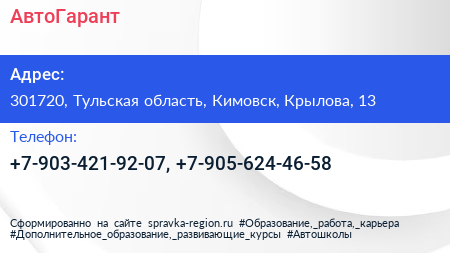 АвтоГарант по адресу 301720, Тульская область, Кимовск, Крылова, 13 в дальнейшем Организация, размещена в следующих категориях: