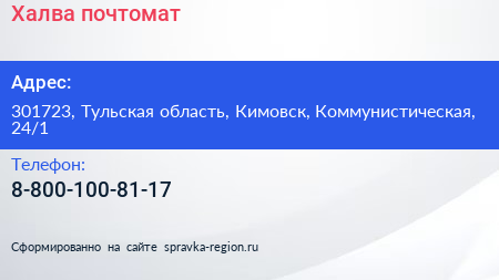 Халва, почтомат по адресу 301723, Тульская область, Кимовск, Коммунистическая, 24/1 в дальнейшем Организация, размещена в следующих категориях: