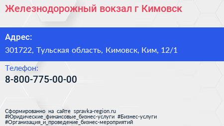 Железнодорожный вокзал, г. Кимовск по адресу 301722, Тульская область, Кимовск, Ким, 12/1 в дальнейшем Организация, размещена в следующих категориях: