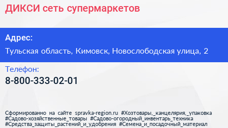 ДИКСИ, сеть супермаркетов по адресу Тульская область, Кимовск, Новослободская улица, 2 в дальнейшем Организация, размещена в следующих категориях: