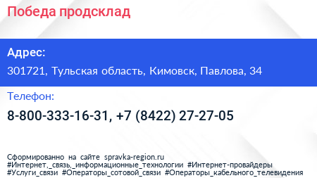 Победа, продсклад по адресу 301721, Тульская область, Кимовск, Павлова, 34 в дальнейшем Организация, размещена в следующих категориях: