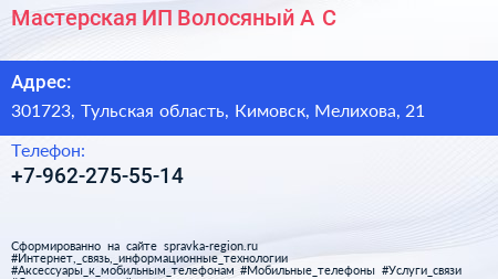 Мастерская, ИП Волосяный А.С. по адресу 301723, Тульская область, Кимовск, Мелихова, 21 в дальнейшем Организация, размещена в следующих категориях: