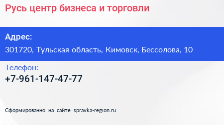 Русь, центр бизнеса и торговли по адресу 301720, Тульская область, Кимовск, Бессолова, 10 в дальнейшем Организация, размещена в следующих категориях: