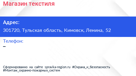 Магазин текстиля по адресу 301720, Тульская область, Кимовск, Ленина, 52 в дальнейшем Организация, размещена в следующих категориях: