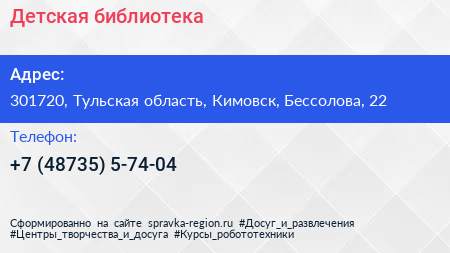 Детская библиотека по адресу 301720, Тульская область, Кимовск, Бессолова, 22 в дальнейшем Организация, размещена в следующих категориях: