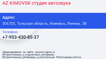 AZ KIMOVSK, студия автозвука по адресу 301721, Тульская область, Кимовск, Ленина, 38 в дальнейшем Организация, размещена в следующих категориях: