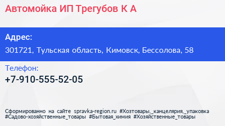 Автомойка, ИП Трегубов К.А. по адресу 301721, Тульская область, Кимовск, Бессолова, 58 в дальнейшем Организация, размещена в следующих категориях: