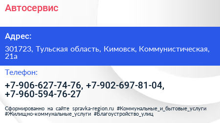 Автосервис по адресу 301723, Тульская область, Кимовск, Коммунистическая, 21а в дальнейшем Организация, размещена в следующих категориях:
