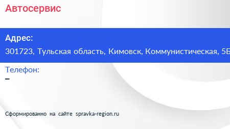 Автосервис по адресу 301723, Тульская область, Кимовск, Коммунистическая, 5Б в дальнейшем Организация, размещена в следующих категориях: