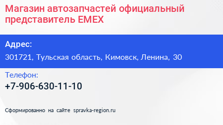 Магазин автозапчастей, официальный представитель EMEX по адресу 301721, Тульская область, Кимовск, Ленина, 30 в дальнейшем Организация, размещена в следующих категориях: