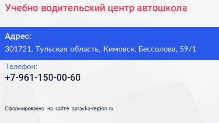 Учебно-водительский центр, автошкола по адресу 301721, Тульская область, Кимовск, Бессолова, 59/1 в дальнейшем Организация, размещена в следующих категориях: