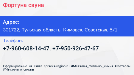 Фортуна, сауна по адресу 301722, Тульская область, Кимовск, Советская, 5/1 в дальнейшем Организация, размещена в следующих категориях: