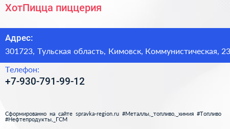 ХотПицца, пиццерия по адресу 301723, Тульская область, Кимовск, Коммунистическая, 23 в дальнейшем Организация, размещена в следующих категориях: