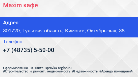 Maxim, кафе по адресу 301720, Тульская область, Кимовск, Октябрьская, 38 в дальнейшем Организация, размещена в следующих категориях: