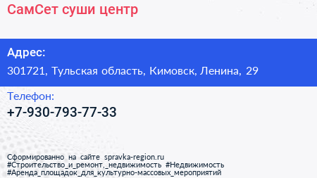 СамСет, суши центр по адресу 301721, Тульская область, Кимовск, Ленина, 29 в дальнейшем Организация, размещена в следующих категориях: