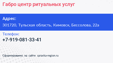 Габро, центр ритуальных услуг по адресу 301720, Тульская область, Кимовск, Бессолова, 22а в дальнейшем Организация, размещена в следующих категориях: