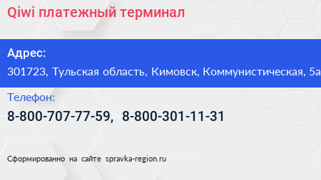 Qiwi, платежный терминал по адресу 301723, Тульская область, Кимовск, Коммунистическая, 5а в дальнейшем Организация, размещена в следующих категориях: