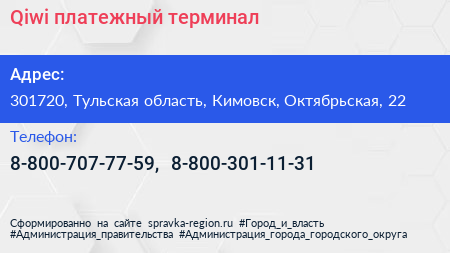 Qiwi, платежный терминал по адресу 301720, Тульская область, Кимовск, Октябрьская, 22 в дальнейшем Организация, размещена в следующих категориях:
