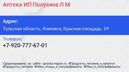 Аптека, ИП Полухина Л.М. по адресу Тульская область, Кимовск, Красная площадь, 19 в дальнейшем Организация, размещена в следующих категориях: