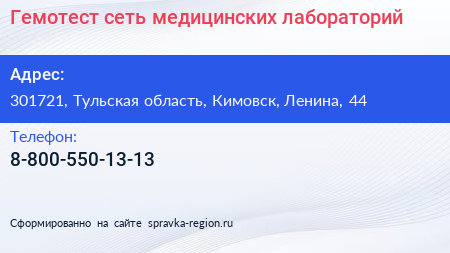 Гемотест, сеть медицинских лабораторий по адресу 301721, Тульская область, Кимовск, Ленина, 44 в дальнейшем Организация, размещена в следующих категориях: