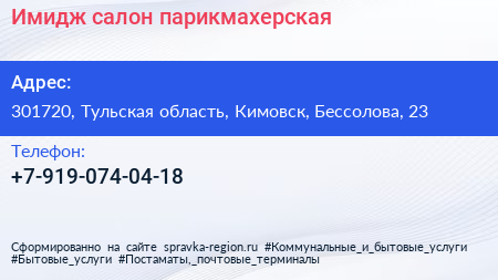 Имидж, салон-парикмахерская по адресу 301720, Тульская область, Кимовск, Бессолова, 23 в дальнейшем Организация, размещена в следующих категориях: