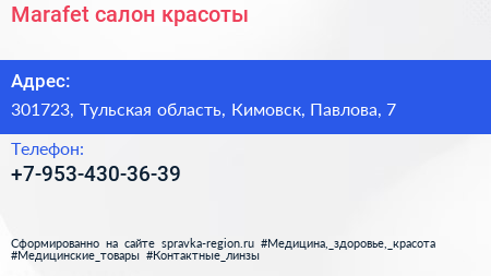 Marafet, салон красоты по адресу 301723, Тульская область, Кимовск, Павлова, 7 в дальнейшем Организация, размещена в следующих категориях: