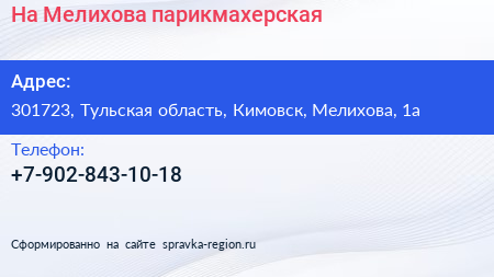 На Мелихова, парикмахерская по адресу 301723, Тульская область, Кимовск, Мелихова, 1а в дальнейшем Организация, размещена в следующих категориях: