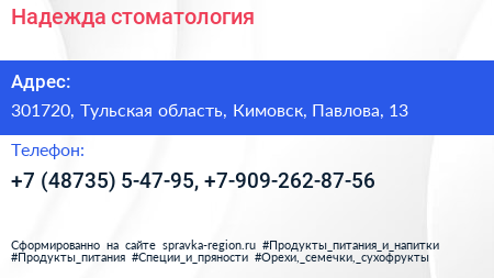Надежда, стоматология по адресу 301720, Тульская область, Кимовск, Павлова, 13 в дальнейшем Организация, размещена в следующих категориях:
