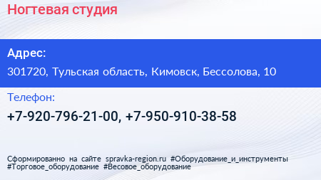 Ногтевая студия по адресу 301720, Тульская область, Кимовск, Бессолова, 10 в дальнейшем Организация, размещена в следующих категориях: