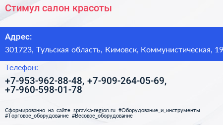 Стимул, салон красоты по адресу 301723, Тульская область, Кимовск, Коммунистическая, 19 в дальнейшем Организация, размещена в следующих категориях:
