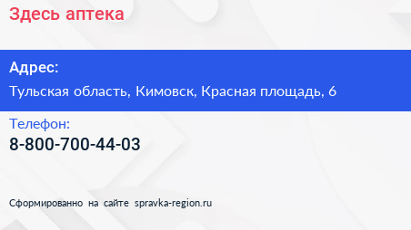 Здесь аптека по адресу Тульская область, Кимовск, Красная площадь, 6 в дальнейшем Организация, размещена в следующих категориях: