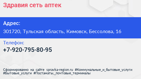 Здравия, сеть аптек по адресу 301720, Тульская область, Кимовск, Бессолова, 16 в дальнейшем Организация, размещена в следующих категориях: