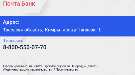 Почта Банк по адресу Тверская область, Кимры, улица Чапаева, 1 в дальнейшем Организация, размещена в следующих категориях:
