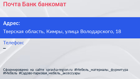 Почта Банк, банкомат по адресу Тверская область, Кимры, улица Володарского, 18 в дальнейшем Организация, размещена в следующих категориях: