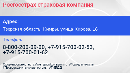 Росгосстрах, страховая компания по адресу Тверская область, Кимры, улица Кирова, 18 в дальнейшем Организация, размещена в следующих категориях: